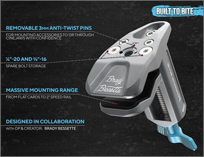 Most super clamps are heavy, clunky, and lack solid mounting points. CineJaws design considered every mounting angle and heavy-duty camera clamp you to mount accessories to NATO or ARRI-style anti-twist locations. Removable 3mm anti-twist pins are stored on the top jaw for mounting accessories to or through CineJaws with confidence.